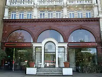 O edifício original da estação, projetado por Leslie Green, ainda permanece ao sul do entroncamento, notável por suas telhas de cor de sangue de boi; era até junho de 2010 usado como pizzaria e, desde 14 de dezembro de 2012, é o Wellesley Hotel. O edifício foi retirado de uso quando a estação recebeu escadas rolantes no lugar de elevadores e um novo saguão subterrâneo que entrou em uso em 23 de maio de 1932[3] embora uma escada de emergência forneça uma conexão com as plataformas. Os eixos de elevação agora são usados para fornecer ventilação. A estação de 1932 tinha vitrines embutidas nas paredes que mostravam uma série de dioramas representando o desenvolvimento do ônibus de Londres - há muito tempo, alguns modelos em escala sobrevivem nas coleções do Museu dos Transportes de Londres.