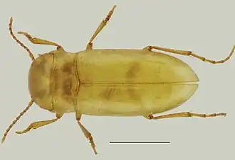 O escaravelho tem 2,8 mm de comprimento e cerca de 1,1 mm de largura[2], não tem asas nem olhos nem côr, numa adaptação a viver num ambiente sem luz solar, e apresenta longos membros que provavelmente farão com que tenha dificuldade em nadar,[1] apesar de ser aquático - as longas patas servirão sobretudo para andar nas superfícies argilosas.[3] É o primeiro coleóptero estigobionte (isto é, que vive em águas subterrâneas) descoberto em Portugal.[2]