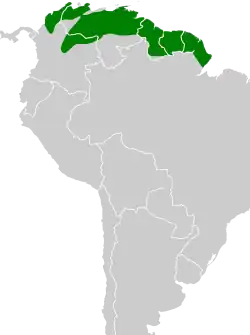 Vive em pântanos e à beira de rios. Ocorre de Trinidad, Colômbia, Venezuela e Guianas até o norte do Brasil.
