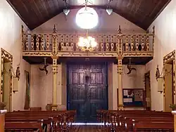 A entrada ao interior, de nave única, se dá sob um coro de madeira com aplicações em relevo, sustentado por duas coluninhas decoradas de corte quadrado. À esquerda se abre uma capela para o Senhor Morto e a Mater Dolorosa, com estatuária do início do século XX. À direita, uma pia batismal em pedra entalhada com uma inscrição em latim, e uma pia menor para a água benta, em linha semelhante, de origem portuguesa. No corredor central, entre as duas séries de bancadas em madeira, o piso é revestido de ladrilhos com desenho geométrico, enquanto que sob as bancadas não possuem decoração. O forro é de madeira aparente em duas águas, mas com vértice truncado.
