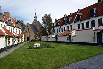Em muitas cidades da Bélgica, principalmente na região do Flandres, existem uma ou mais beguinarias, pequenas cidades na cidade, rodeadas por muralhas, onde os chamados beguinos retiram-se para vida de meditação e oração, e, sobretudo, de caridade ativa. Não são considerados mosteiros, mas sim comunidades de leigos (incluindo muitas viúvas), que recebem uma pequena casa sem qualquer tipo de custo.