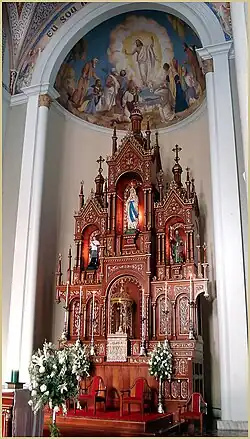 A capela-mor em forma de abside se ergue um pouco do nível da nave, desta separada por um grande arco redondo, e é arrematada com uma meia-cúpula com uma pintura mostrando a ressurreição de Cristo. O retábulo ao fundo é uma fina peça de talha neogótica, também de Bartelle, com partes em douramento. Em um nicho elevado está a estátua da Padroeira, Nossa Senhora de Lourdes, com uma coroa de ouro confeccionada pela Metalúrgica Abramo Eberle.[1]