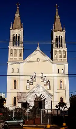 A igreja tem um estilo modernista com fortes traços românicos. Tem um frontispício revestido de mármore em arcos concêntricos sob um frontão triangular decorado com cornijas destacadas. Acima dele se abrem seis janelas esguias, sob um frontão que imita o do frontispício e inclui um pequeno óculo.[1]