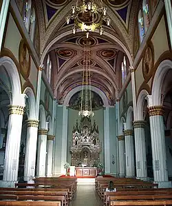 A nave central é separada das laterais por grandes colunas de capitel românico, sustentando arcos redondos e um clerestório com janelas geminadas, todas decoradas com vitrais. O teto é uma série de abóbadas de aresta, decoradas com pinturas em motivos florais com medalhões para imagens de santos. Grandes lustres de bronze dourado pendem de cima, e o piso é em ladrilhos com padrões geométricos.[1]
