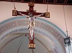 Ao fundo da nave se localiza a capela-mor, com desenho absidal, delimitada por um grande arco redondo ornamentado, em cuja frente pende do teto um monumental crucifixo de madeira, cuja autoria é atribuída a André Arjonas.[1] Arjonas era o diretor artístico da oficina de decoração de Jacob Aloys Friedrichs, colaborou nos projetos do altar-mor e da estatuária em mármore que adorna os altares e, com seus assistentes, foi responsável pela sua execução.[9] Abaixo da cruz suspensa fica o altar-mor, e atrás o retábulo para o Padroeiro, uma criação original que emprega elementos vazados para delinear uma moldura arquitetural discreta e graciosa em torno da imagem de São José com o Menino Jesus nos braços.[1]