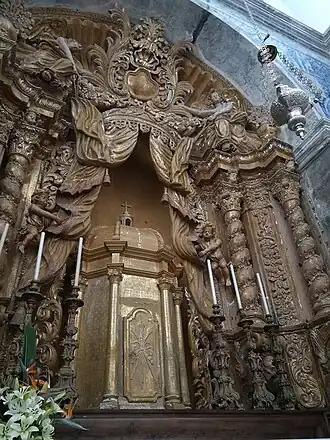 No seu interior é de destacar o seu mobiliário, a constituição dos retábulos numa conjugação de talha dourada com elementos característicos do estilo Rococó, bem como os preciosos painéis de azulejos policromados em azul e branco e as esculturas religiosas ornamentadas com ourivesarias minuciosamente trabalhadas, incluindo esculturas processionais de estilo Roca.