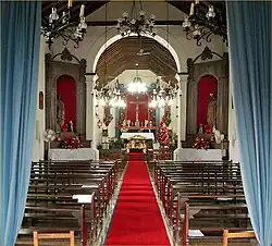 Seu interior era da maior singeleza, embora não desprovido de charme. À esquerda da entrada havia um confessionário neogótico e uma sala guardava belas imagens processionais de roca, uma do Senhor Morto, e outra do Senhor carregando a Cruz. À direita uma escada sobe para o coro de madeira, suportado por colunas também de madeira de capitel coríntio muito simplificado. Um balaústre de madeira de ripas sinuosas completa o conjunto do coro.[6]