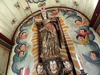 O teto da capela-mor tem uma grande pintura representando Nossa Senhora dos Anjos rodeada de figuras dos Evangelistas. O altar escalonado tem estrutura pintada simulando colunas e detalhes entalhados, com um frontispício coroado pelo emblema franciscano sustentado por dois anjos entalhados.[1] No nicho estão instaladas duas importantes e requintadas estátuas policromadas, em tamanho acima do natural e de feição erudita, uma representando Nossa Senhora dos Anjos, com um cetro na mão direita e apoiada em um pedestal de nuvens e cabeças de querubins, e abaixo dela, um São Francisco de Assis, que segura uma cruz e uma caveira, símbolos do martírio e da penitência, ambas de autoria de Domingos Pinto Coelho. Por trás das imagens, o fundo do nicho tem uma moldura pintada com um resplendor de nuvens, de onde emergem várias cabeças de querubins. No teto do nicho aparece uma representação do Divino Espírito Santo cercado de ramalhetes de rosas.[1][3] Também há uma bela imagem do Senhor Morto, instalada sob a mesa do altar, do mesmo Pinto Coelho.[3]
