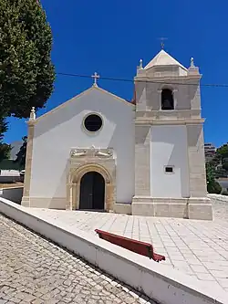 A fachada principal, orientada a Ocidente, é de pano único em empena angular rematada por cruz em pedra. Nela se impõe a maciça torre sineira, de grande volume e secção quadrada, quase desproporcional em relação ao edifício. Delimitada por grossos cunhais de cantaria, a torre abre-se no primeiro piso por fresta gradeada e no segundo piso por esguio campanário em cada face. É sobrepujada por quatro pináculos que ornam os cantos do plano onde assenta uma pequena garrida e coruchéu, encimado por cata-vento e cruz em ferro.