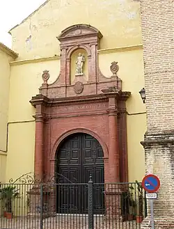 A entrada, situada no muro da Epístola, estrutura-se com um vão de médio ponto, flanqueado por colunas toscanas sobre basamento e frontão triangular superior, em cujo tímpano apresenta a cruz de Malta no interior de uma moldura circular e em ambos lados se arremata com jarros.