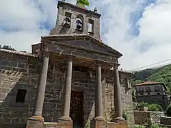 É inserido por um pórtico de ordem toscana suportado em quatro colunas que tem um frontão triangular. A estrutura da igreja é construída em torno de uma cúpula central octogonal. Esta distribuição foi muito comum entre os arquitetos bascos do final do século XVIII e início do século XIX. É possível que o projeto fosse José Alday, nativo de Ceberio, Vizcaya, que era o prefeito do bispado da cidade de Santander.[2] Na fachada fica uma torre de sino. No fundo do pórtico há uma inscrição em que ele percebe a consagração da igreja e seus patronos. Esta igreja, juntamente com o palácio, é um dos poucos exemplos de arquitetura neoclássica conservados em Cantabria.[3]