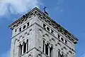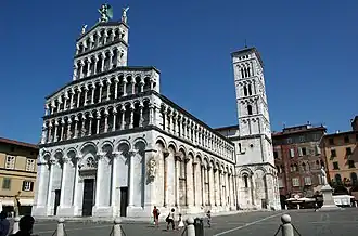 A presente construção é produto de uma reforma ordenada pelo Papa Alexandre II, entre 1061 e 1073, sendo um primoroso exemplo do primeiro estilo românico desenvolvido em Lucca. A autoria do projeto é incerta, mas pode ter sido de Guidetto da Como. As obras continuaram no século XII, completando o corpo do edifício, onde aparece influência da arquitetura de Pisa. Neste período foi erguido também o campanário. A parte superior da fachada data do século XIV, quando as obras foram interrompidas, possivelmente por falta de recursos. A fachada apresenta um verticalismo típico do gótico, mas sua decoração ainda é românica. Destacam-se no topo um grupo de estátuas de São Miguel e anjos, e no canto direito do corpo da igreja, uma estátua da Virgem Maria com o Menino Jesus, de Matteo Civitali. A fachada abunda em motivos decorativos típicos da cultura Lucchese, incluindo plantas, animais, figuras humanas e signos zodiacais, e as colunetas são de formas muito variadas.[2]