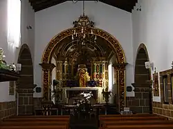O interior apresenta nave única, com destaque para os arcos de comunicação com os braços do falso transepto em cantaria e com bases e impostas muito salientes, o portal de comunicação com a sacristia, e uma intervenção mais recente que inclui um lambril de pedra (capeada) que se estende envolvendo os vãos de algumas portas e do confessionário. Da mesma época serão as molduras em pedra, de ambos os lados da nave principal, que enquadram catorze painéis de azulejo com os passos da paixão de Cristo. O arco da capela-mor, de invocação de São Pedro, é forrado em talha e tem, no cimo, as Armas Reais Portuguesas. Nesta capela, além da imagem do padroeiro, encontram-se a de São José e a de Santa Ana, e um valioso crucifixo de marfim, tendo estas últimas imagens vindo do Convento de Nossa Senhora da Vitória em Vila do Porto. O sacrário por sua vez, pertenceu à Igreja do Recolhimento de Santo António na mesma vila.[6]