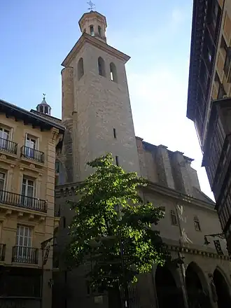 Na sua arquitetura destacam-se as suas altas torres e o pórtico, decorado com belos relevos góticos, como as de Santiago peregrino ou a de São Saturnino. O interior é constituído por uma nave gótica única muito ampla com uma abóbada de seis painéis, cabeceira poligonal, capelas entre os contrafortes. um coro elevado e uma grande capela barroca lateral. Esta capela, dedicada à Virgem do Caminho, ocupa o que até ao século XVII era o claustro.