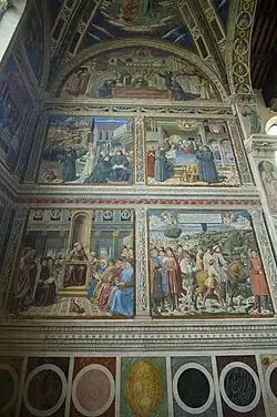 O altar-mor é decorado com uma tela de Piero del Pollaiuolo de 1483, representando a Coroação da Virgem, com santos e anjos músicos. Por trás se abre a capela-mor, com uma justamente célebre série de afrescos de Benozzo Gozzoli, auxiliado por Pier Francesco Fiorentino e Giusto d'Andrea, ilustrando cenas da vida de Santo Agostinho, datada de 1464-1465. A capela à direita está decorada com afrescos representando cenas da Vida da Virgem de Bartolo di Fredi (1374 - 1375), copiados a partir de cenas, mais tarde perdidas, pintadas em 1335 por Simone Martini, Ambrogio Lorenzetti e Pietro Lorenzetti sobre a fachada do Hospital de Santa Maria della Scala, em Siena. Sobre o altar desta capela há uma pintura do Nascimento de Maria, de Vincenzo Tamagni, de 1523. Na capela da esquerda, também chamada de Capela do Sacramento, foi colocado um quadro de escola florentina (c. 1430-1440) figurando uma Pietà com episódios da Paixão.
