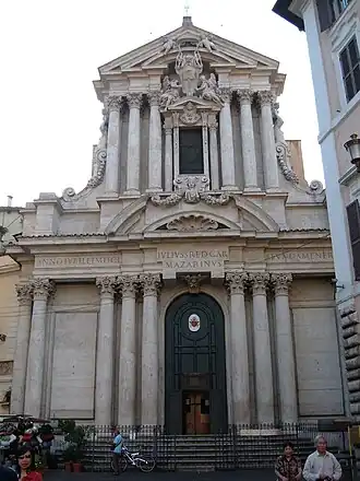 A igreja foi reconstruída por ordem do cardeal Mazarino, cujo brasão e galero, apresentados de forma triunfal e segurado por anjos, é o foco central da composição da fachada. Rumores da época indicam que a sobrinha de Mazarin, Marie Mancini, uma amante de Luís XIV da França, também está representado na fachada, no mascarão feminino central.[7] A escultura de uma leiga e o fato de o brasão do catedral estar apoiado esculturas de duas mulheres de peito desnudo tornam esta igreja única entre as igrejas de Roma.