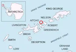 Localização da Ilha Aitcho nas Ilhas Shetland do Sul. Administrada sob o Sistema do Tratado Antártico. Com 0,45 Km de comprimento e 0,26 Km de largura. | |