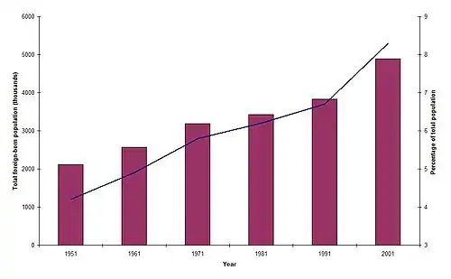 Cerca de metade da população aumentou entre os censos de 1991 e 2001 devido a imigração dos não nativos. 4,9 milhões de pessoas[2] (8,3 por cento da população na época) nasceram no estrangeiro, apesar do censo não dar qualquer indicação do seu status de imigração ou intenção da duração de permanência.
