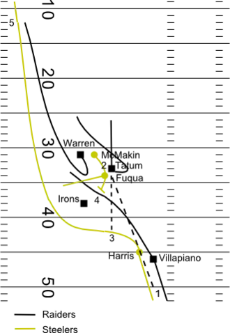 O quarterback dos Steelers Terry Bradshaw (1 no diagrama), sob grande pressão dos defensive ends dos Raiders Tony Cline e Horace Jones, arremessou a bola para a linha de 35 jardas dos Raiders, em direção ao running back John "Frenchy" Fuqua. O safety dos Raiders Jack Tatum colidiu com Fuqua durante a tentativa de recepção da bola (2). O golpe de Tatum derrubou Fuqua no chão e mandou a bola várias jardas para trás.