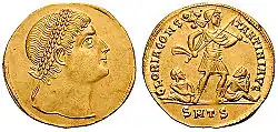 Durante o governo de Diocleciano e Maximiano, uma tentativa malsucedida foi feita para fornecer ao império um sistema monetário coerente e estável como o que existia antes da inflação.[84] Algumas moedas de ouro e prata foram emitidas, mas a maioria eram numos de liga de cobre, o que não impediu que os preços continuassem subindo.[84] Foi no governo de Constantino que se iniciou a emissão de uma nova moeda de ouro denominada soldo, que fornecia uma referência de valor estável e reconhecida.[93] Para isso, buscou-se, de várias maneiras, aumentar a quantidade desse metal nas mãos do Estado: uma sobretaxa em ouro foi introduzida no imposto sobre a terra, os aluguéis das propriedades imperiais foram coletados em ouro, o imposto auro coronário (aurum coronarium) foi mantido e os tesouros dos templos pagãos foram confiscados.[93] O processo de emissão foi fundamental para a manutenção de seu prestígio, pois tudo o que era arrecadado em ouro (moedas ou não) era derretido e enviado para as casas da moeda, onde era cunhado novamente como novos soldos e, portanto, sua pureza estava garantida.[94] O cobre, entretanto, continuou a ser emitido em grandes quantidades na forma de numos com praticamente nenhuma quantidade de prata. Como, ao contrário do ouro, essas moedas não voltaram aos cofres imperiais, o sistema foi inundado e os preços continuaram a subir.[94] Somente no ano 395 a emissão de moedas foi praticamente abandonada para pagamentos em que o costume exigia seu uso (doações às tropas).[95] Miliarenses no valor de 1/18 do sólido foram emitidos deste metal e síliqua cuja correspondência com o soldo foi estabelecida em 1/24 de seu valor.[96] O ouro, entretanto, continuou a ser colocado em circulação em grandes quantidades, tanto na forma de sólidos como de suas frações: semisses (50% do seu valor) e tremisses (⅓ do seu valor).[95]
