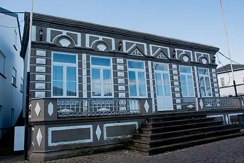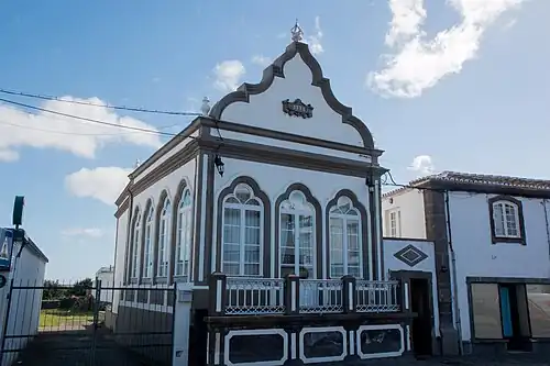Todos os vãos são rematados em arco trilobado, sendo que as janelas de peito têm uma pequena guarda em ferro fundido. O balcão apresenta também uma guarda de ferro fundido entre pilaretes de alvenaria. A cimalha é constituída por cornija e platibanda, encimada por um frontão recortado contracurvado sobre a fachada principal. No tímpano existe uma cartela onde é possível ler a inscrição "1916". Sobre o vértice do frontão está uma coroa do Espírito Santo.