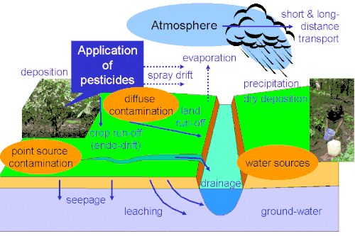 Existem quatro rotas principais através das quais os pesticidas atingem a água: podem sair da área-alvo quando pulverizados, podem percolar ou lixiviar através do solo, podem ser transportados como escoamento ou podem ser derramados, por exemplo acidentalmente ou por negligência.[31] Eles também podem ser levados para a água pela erosão do solo como escoame.[32] Os fatores que afetam a capacidade de um pesticida de contaminar a água incluem sua solubilidade em água, a distância de um local de aplicação a um corpo de água, clima, tipo de solo, presença de uma cultura em crescimento e o método usado para aplicar o produto químico.[33]