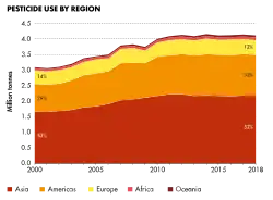 Modelagens ambientais indicam que globalmente mais de 60% das terras agrícolas (~24,5 milhões de km²) está "em risco de poluição por pesticidas por mais de um ingrediente ativo", e que mais de 30% está em "alto risco", dos quais um terço está em regiões de alta biodiversidade.[4][5] Cada pesticida ou classe de pesticida vem com um conjunto específico de preocupações ambientais. Tais efeitos indesejáveis levaram ao banimento de muitos pesticidas, enquanto a regulamentação limitou e/ou reduziu o uso de outros. A disseminação global do uso de pesticidas, incluindo o uso de pesticidas mais antigos/obsoletos que foram proibidos em algumas jurisdições, aumentou em geral.[6][7]
