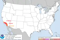 O NWS também emitiu sua categoria mais severa de alerta de bandeira vermelha com a situação particularmente perigosa, para os condados de Los Angeles e Ventura, indicando extremo perigo de incêndio.[32] O alerta enfatizou especificamente a possibilidade de crescimento rápido do fogo e comportamento extremo do fogo devido à combinação de ventos fortes e baixos níveis de umidade. O sul da Califórnia experimentou uma aridez crescente desde o final do verão de 2024, à medida que os sistemas de tempestades afetaram predominantemente o noroeste do Pacífico. No final de dezembro de 2024, a maior parte do condado de Los Angeles havia entrado em estado de seca moderada, criando maior vulnerabilidade a incêndios devido à vegetação ressecada no que era tradicionalmente a estação chuvosa da região.[29][33]