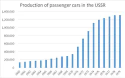 1948 marcou o início da exportação soviética de carros. Em 1950, carros da União Soviética estavam presentes na feira internacional de automóveis em Poznań, na Polônia, e logo depois foram exportados para a Europa Ocidental. No final da década de 1950, a União Soviética produziu 43 modelos de carros, e em 1957 o número total de automóveis produzidos foi de 495.994, incluindo 113.588 carros, 369.504 caminhões e 12.316 ônibus, e no ano seguinte alcançou o nível de 600.000 carros por ano.[11]