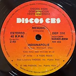 - ↑ (1983) Créditos do álbum Indianapolis por Menudo [LP]. Argentina: Discos CBS S.A.I.C.F. (DEP.310).