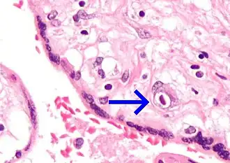 Micrografia de placentite por citomegalovírus (CMV). coloração H&E. CMV é uma infecção TORCH. Em comparação com a corioamnionite, a infecção TORCH é bastante incomum. Eles podem resultar em aborto (aborto espontâneo). As vilosidades na imagem têm inflamação marcada que é predominantemente linfocítica. Uma célula CMV característica é vista à direita do centro da imagem. Os glóbulos vermelhos que cercam as vilosidades coriônicas são maternos. Imagens relacionadas.
