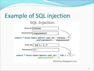 Injeção de SQL (do inglês SQL Injection) é um tipo de ameaça de segurança que se aproveita de vulnerabilidades em sistemas que trabalham com bases de dados realizando ataques com comandos SQL; onde o atacante consegue inserir uma instrução SQL personalizada e indevida através da entrada de dados de uma aplicação, como formulários ou URL de uma aplicação online.[1]