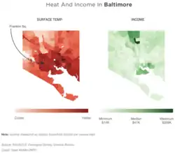 O gráfico acima demonstra a correlação entre renda e calor na cidade de Baltimore, Maryland. Os bairros de baixa renda são vistos com temperaturas de verão mais altas do que os bairros de alta renda durante o mesmo período. Os dados foram fornecidos aos autores Anderson e Mcminn pela NASA/US Geological Survey, Census Bureau.