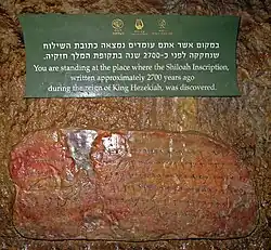 Esta inscrição registra a construção do túnel de Ezequias, e é usada ao se comparar datas de outras inscrições hebraicas encontradas. De acordo com o texto, o trabalho começou em ambas as extremidades simultaneamente e prosseguiu até que os construtores se encontraram no meio.
