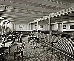 Debaixo do convés de popa havia dois espaços de encontro para os passageiros da Terceira Classe, o Salão Geral do lado estibordo e a Sala de Fumantes da Terceira Classe do lado bombordo. Ambas eram modestamente decoradas com paredes de painéis de pinho pintadas de branco, piso de linóleo e longos bancos de madeira para sentar. O Salão de Fumantes, um domínio só para homens, tinha seu próprio bar, escarradeiras e mesas presas ao chão para jogar cartas e outras atividades.