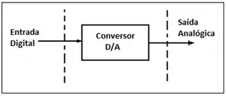 Sobre o D/A: Dizemos que o conversor digital-analógico converte uma palavra digital em um sinal analógico sob a forma de uma tensão ou corrente de saída, são formados por elementos passivos, fontes de referência, chaves e AMPOPs. A conversão é em geral paralela e o tempo de conversão depende essencialmente da velocidade dos componentes utilizados. Analisando os sinais que são gerados por circuitos analógicos são muitas vezes processados por circuitos digitais, por exemplo, temos o microcontrolador ou por um microcomputador. Ao certo para processar os sinais analógicos usando circuitos digitais, deve-se efetuar uma conversão para essa última forma, a digital (leia: conversão analógico-digital), onde a conversão é efetuada por um Conversor Analógico-Digital ("A/D converter" ou ADC). O sinal recebido, depois de digitalizado, é processado e, na maioria das vezes será utilizado para atuar sobre o circuito analógico que gerou o sinal original ou até mesmo sobre outro circuito. Por isso, um sinal na forma digital, para ser processado por um bloco funcional analógico, deve ser previamente convertido (ou reconvertido) para a forma analógica equivalente. Um sistema que aceita uma palavra digital como entrada e traduz ou converte o valor recebido para uma voltagem ou correntes analógicas proporcionais à entrada é chamado de Conversor digital-analógico ("D/A converter" ou DAC).