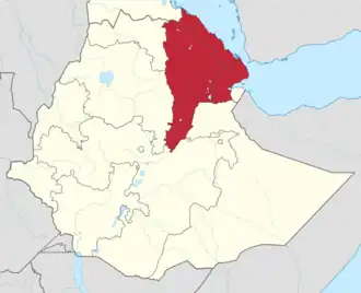 ![]() Mapa com áreas de maioria Afar destacadas em vermelho. | |||
