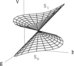 Representação gráfica das superfícies de energia potencial na vizinhança de uma intersecção cónica. A forma das superfícies em cone duplo partilhando o apex é característico das intersecções cónicas.
