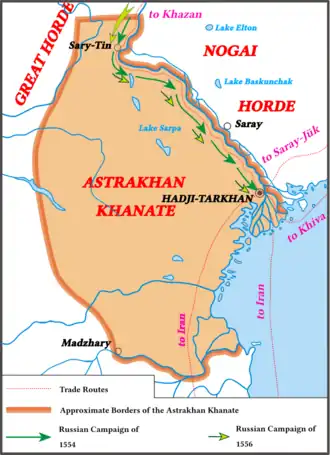 ![]() Mapa em inglês do Canato de Astracã, incluindo cidades, rios, lagos, rotas comerciais, direções das campanhas de 1554/1556 e estados próximos | |||