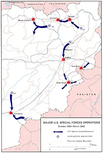 Durante os primeiros meses, os militares dos Estados Unidos tinham uma presença limitada em solo. Forças Especiais e oficiais de inteligência com formação militar colaboraram com as milícias afegãs e avançaram após o Taliban ser perturbado pelo poder aéreo.[99][100][101]