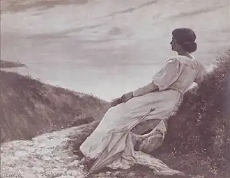 Para a historiadora de arte Maria da Luz Quintão de Jesus Pinheiro[34], a pintura "Sous les Pommiers" (1912) utiliza o jardim como local de introspecção, exacerbando o sentimento melancólico e meditativo. A personagem aborda directamente o observador através do olhar, e o contexto evidencia o estatuto de mulher privilegiada, através da empregada que prepara o seu chá. Trata-se também de um testemunho da importância dada pelas mulheres privilegiadas à instrução, representando personagens femininas a ler, ou no caso de "La Réponse" (1909) à importância da escrita na vida da mulher. Neste caso à escrita epistolar, representando uma mulher que pousou a sua sombrinha e o seu chapéu, sentando-se perante uma pequena secretária repleta de cadernos, juntamente com a tentativa de resposta que foi rejeitada pela personagem e se encontra disposta sobre o soalho, remetendo o observador para o estado psicológico da modelo.
