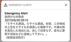 - ↑ «Disaster agency urges municipalities to upgrade J-Alert receivers». The Japan Times Online. 7 de agosto de 2017. Consultado em 29 de agosto de 2017. Arquivado do original em 30 de agosto de 2017