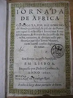- IORNADA DE AFRICA COMPOSTA POR HIERONYMO de Mendoça, natural da cidade do Porto : em a qual se responde a Hieronymo Franqui, & outros, & se trata do sucesso da batalha, cativeiro, & dos que nelle padecerão por não serem Mouros, com outras cousas dignas de notar… Com licença da Sancta inquisição. EM LISBOA. Impresso por Pedro Crasbeeck ANNO 1607