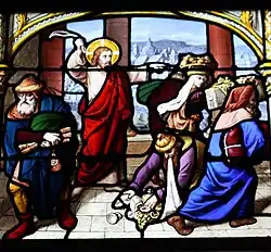 Neste episódio, Jesus e seus discípulos viajam a Jerusalém para a Pessach (a Páscoa judaica) e lá ele expulsa os cambistas do Templo de Jerusalém (o "Templo de Herodes" ou "Segundo Templo"), acusando-os de tornar o local sagrado em um covil de ladrões através de suas atividades comerciais desonestas e desrespeitosas.[1][2] No Evangelho segundo João, Jesus se refere ao Templo como "casa de meu Pai", clamando para si assim o título de Filho de Deus.[3]