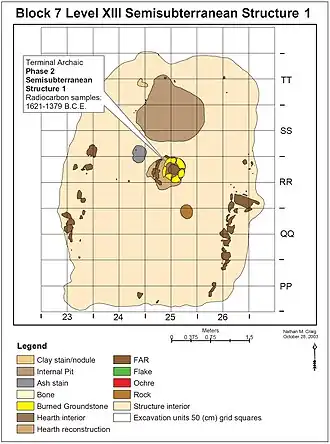 A arquitetura doméstica revelada durante a escavação nos fornece uma evidência de que existia uma mobilidade residencial reduzida na região (fim do Nomadismo). Foram encontrados três abrigos, uma estrutura semi-subterrânea e duas estruturas construídas acima do solo durante as escavações e feitas vinte e cinco datações por radiocarbono mostrando que os abrigos eram bem antigos (cerca de 3000 a.C;), a estrutura semi-subterrânea é intermediária, e as estruturas acima do solo mais novas (cerca de 1200 a.C).[7] Esta mudança nas estruturas dos abrigos para estruturas acima do solo é outro exemplo de uma transição arquitetônica clássica observada em muitas partes do mundo.[8][9]