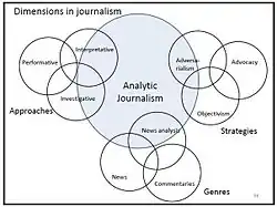 O jornalismo analítico incorpora diferentes abordagens, estratégias e gêneros jornalísticos. O gráfico abaixo ilustra as características únicas do jornalismo analítico. Ele ilustra como o jornalismo analítico se baseia em múltiplas, mas não em todas as disciplinas jornalísticas.