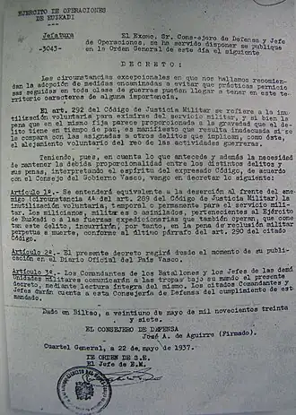 Em Junho de 1937, as tropas de Franco quebraram o conhecido Anel de Ferro de Bilbau e entraram na capital de biscaia graças à traição de Alejandro Goicoechea. Aguirre mudou o seu governo para Trucios antes de ir para Santander e depois para a Catalunha, onde estava preparado para continuar a lutar com os seus homens. Enquanto isso, o dirigente nacionalista basco Juan de Ajuriaguerra acertou um acordo de rendição em Santoña com os italianos (Acordo de Santoña), que não seria apoiado por Franco.