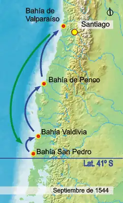 Em 1544 Pedro de Valdivia encarregou Pastene de explorar as costas do sul, ordenando-lhe que chegasse ao Estreito de Magalhães. Embora não tenha alcançado esse objetivo, explorou grande parte da costa. Ele foi o primeiro a chegar à Baía de Concepción, em 18 de setembro,[1] no navio "San Pedro", e tomou posse dela.
