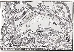 A proibição judaica de comer carne de porco vem da Torá, no livro de Levítico, capítulo 11, versículos 2 a 8.[6][7] A disposição dos judeus ao redor, amamentando-se e tendo relações sexuais com o animal (por vezes considerado como o diabo[3]), é uma zombaria do judaísmo e exemplo de propaganda antissemita.[8]
