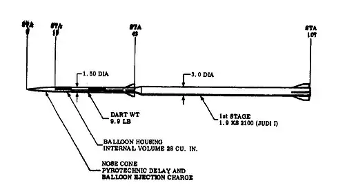 O dardo, era um cilindro de 4 cm de diâmetro e cerca de 1m de altura, balística e aerodinamicamente otimizado, de forma a tingir, por inércia, as altitudes pretendidas. O diâmetro desse dardo variava um pouco dependendo das cargas úteis utilizadas.[1]